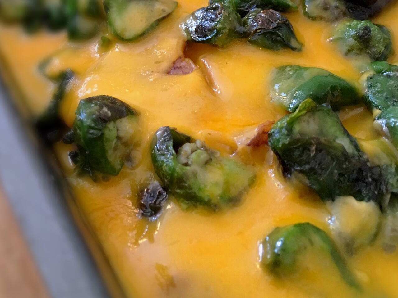 An easy dish that satisfies. My main adjustment here was to incorporate blistered padron chilis. Many recipes call for green bell peppers, but padrons are in season and so much tastier. Add scallions if you like, or substitute another green chili.