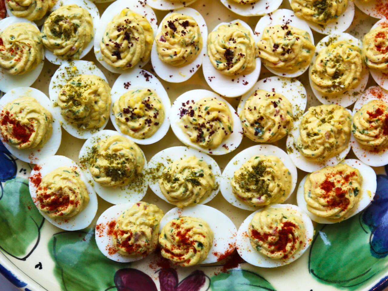 Mix the contents of the bowl well by mashing them together with a fork; add salt to taste. Using a spoon, put a bit of the yolk mixture back into each of the whites and serve them on a platter at room temperature.
