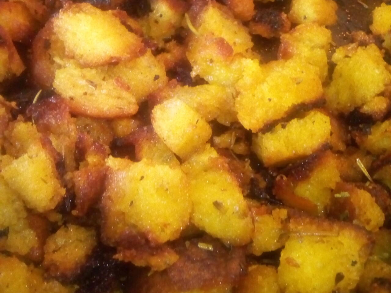 According to how much bread cubes you have, mix oil and vinegar with spices. For about 3 cups of cubes, about ½ cup of oil and ⅛ cup of vinegar. Spices can be turmeric, saffron, curry, nutmeg, ground ginger, paprika, or any red or yellow spice. Herbs can be rosemary, oregano, basil, celery, hot pepper flakes, thyme, sage, etc. Garlic powder or garlic salt can be added, to taste.