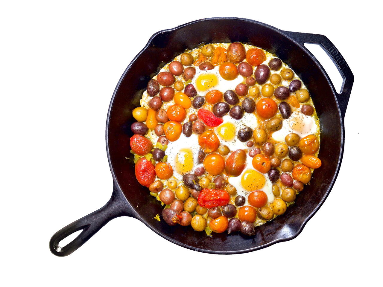 Crack the eggs, one by one, into the skillet, separating the eggs and potatoes to make little spaces for the eggs to lay.