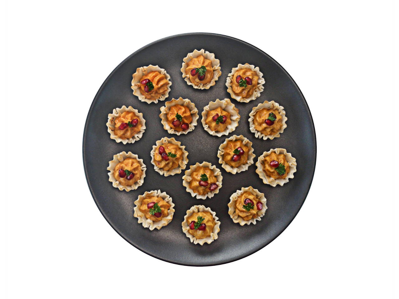 Add the sauce to a piping bag or plastic bag to pipe the sauce ino the phyllo cups. Alternatively, spoon the dip into the phyllo cups. Top with a few pomegranate arils and they are ready to eat!