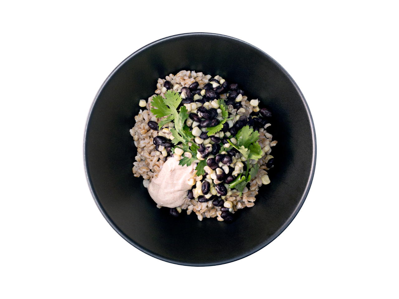 Assemble your bowls. A base of farro, topped with a scoop of sauteed corn and beans. Finish with the yogurt sauce and a few sprigs of cilantro if available.