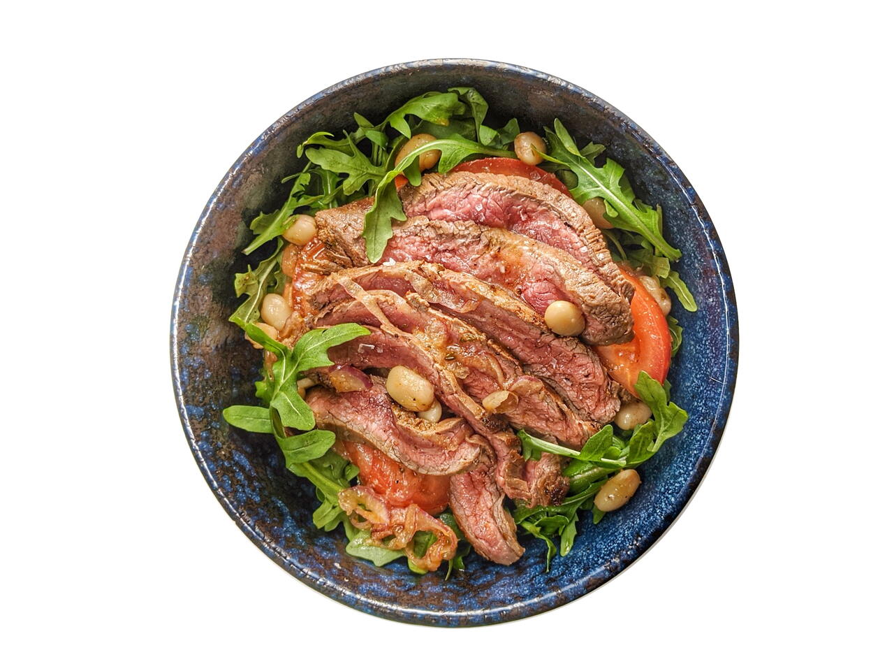 Start with a little bed of arugula. Add some of the bean salad. Top with sliced flank steak.
