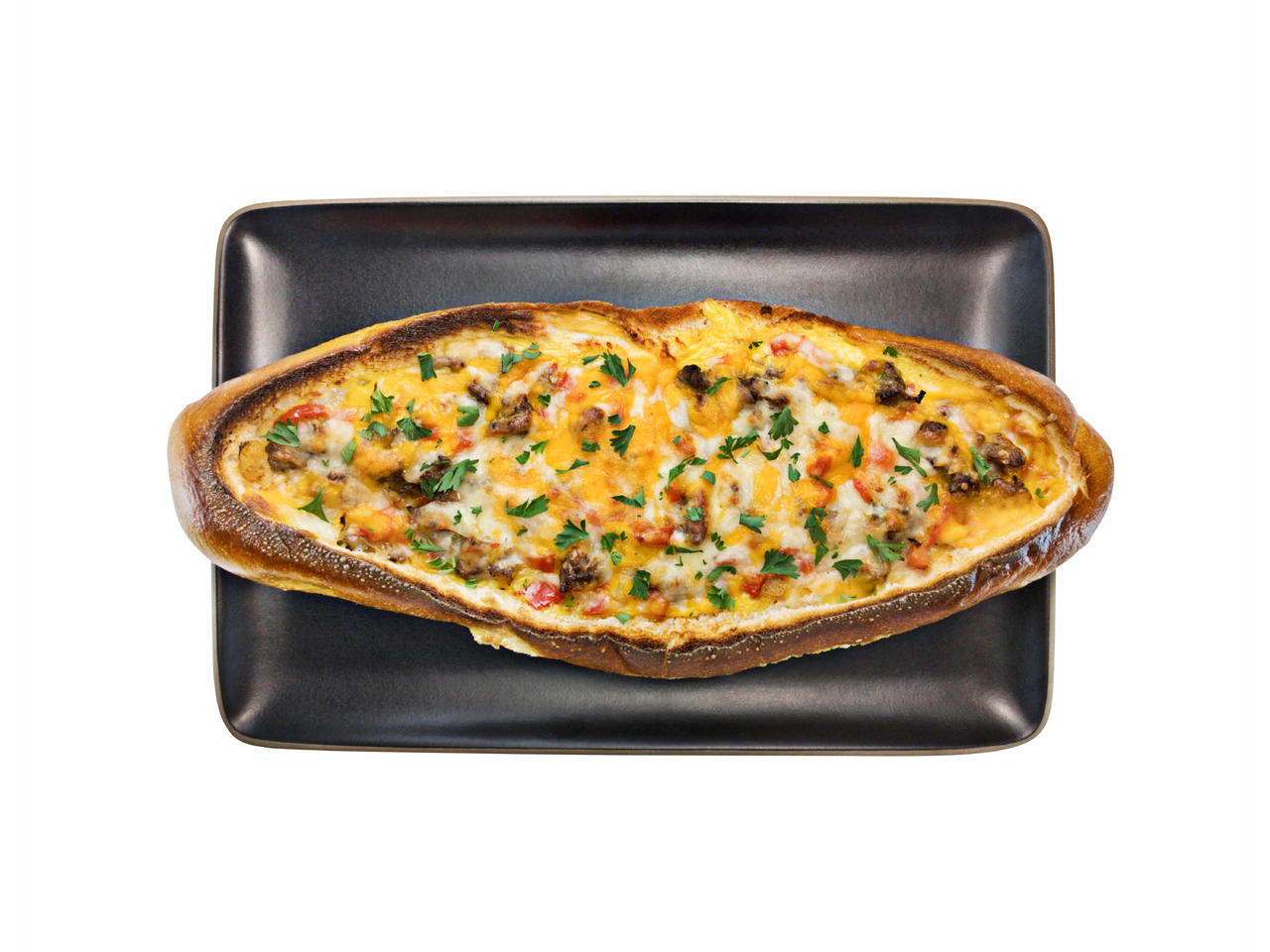 This is a fun and portable way to eat your breakfast. Slice this french bread breakfast boats into slices and reheat for a filling on-the-go meal!