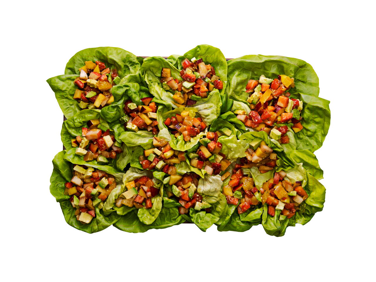 Wash and lay out leaves of butter lettuce on a platter. Fill each leaf with salad and top with avocado.