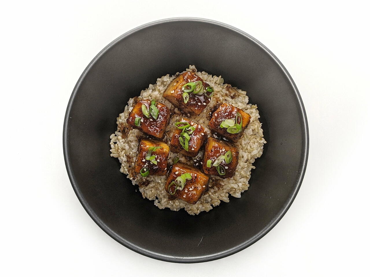 Simmer until the sauce is thickened enough to stick to the tofu. Serve over rice and garnish with sliced scallions.