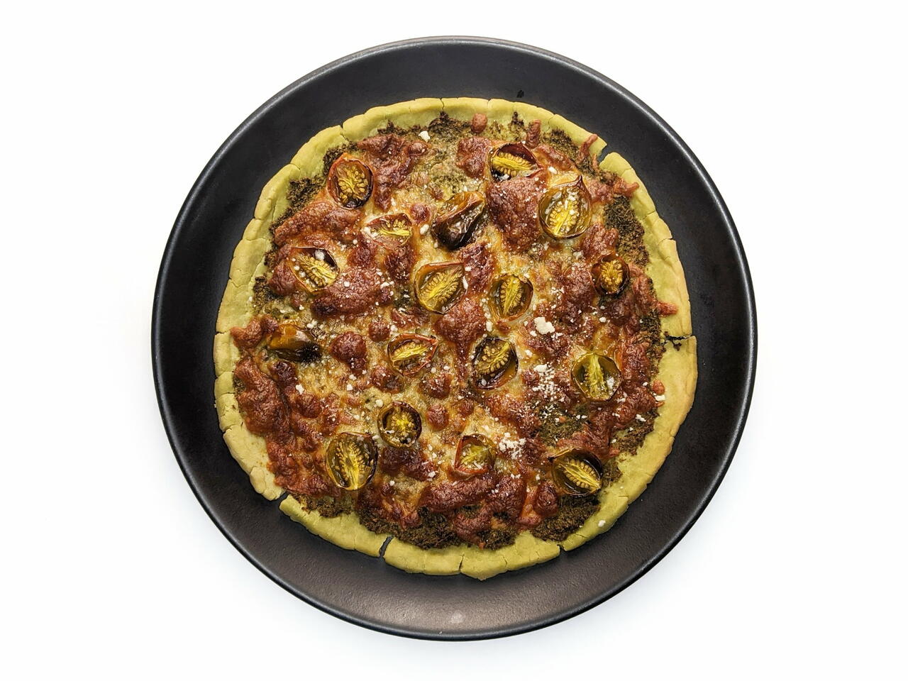 There are a number of gluten-free pizza crust mixes, all with similar instructions. You'll have to experiment to find the one you like. Whatever the dough, pesto and sweet cherry tomatoes make for a great topping.