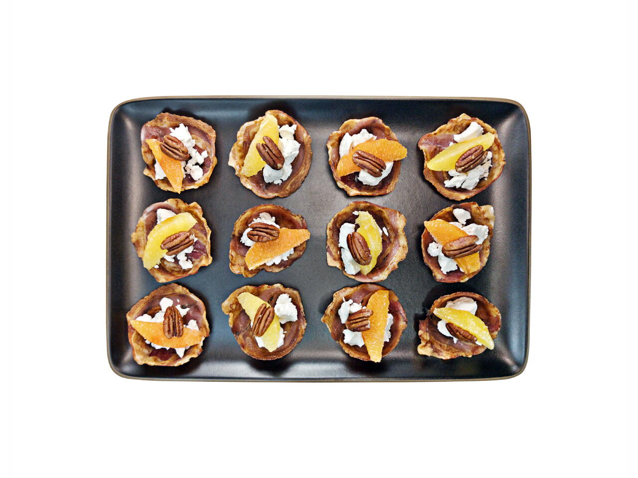 Top the goat cheese with an orange segment and whole roasted pecan.