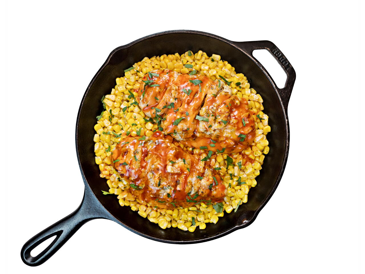 Once the corn is hot and butter is all melted in, serve the chicken over the corn and pour any sauce left on the pan over the top.