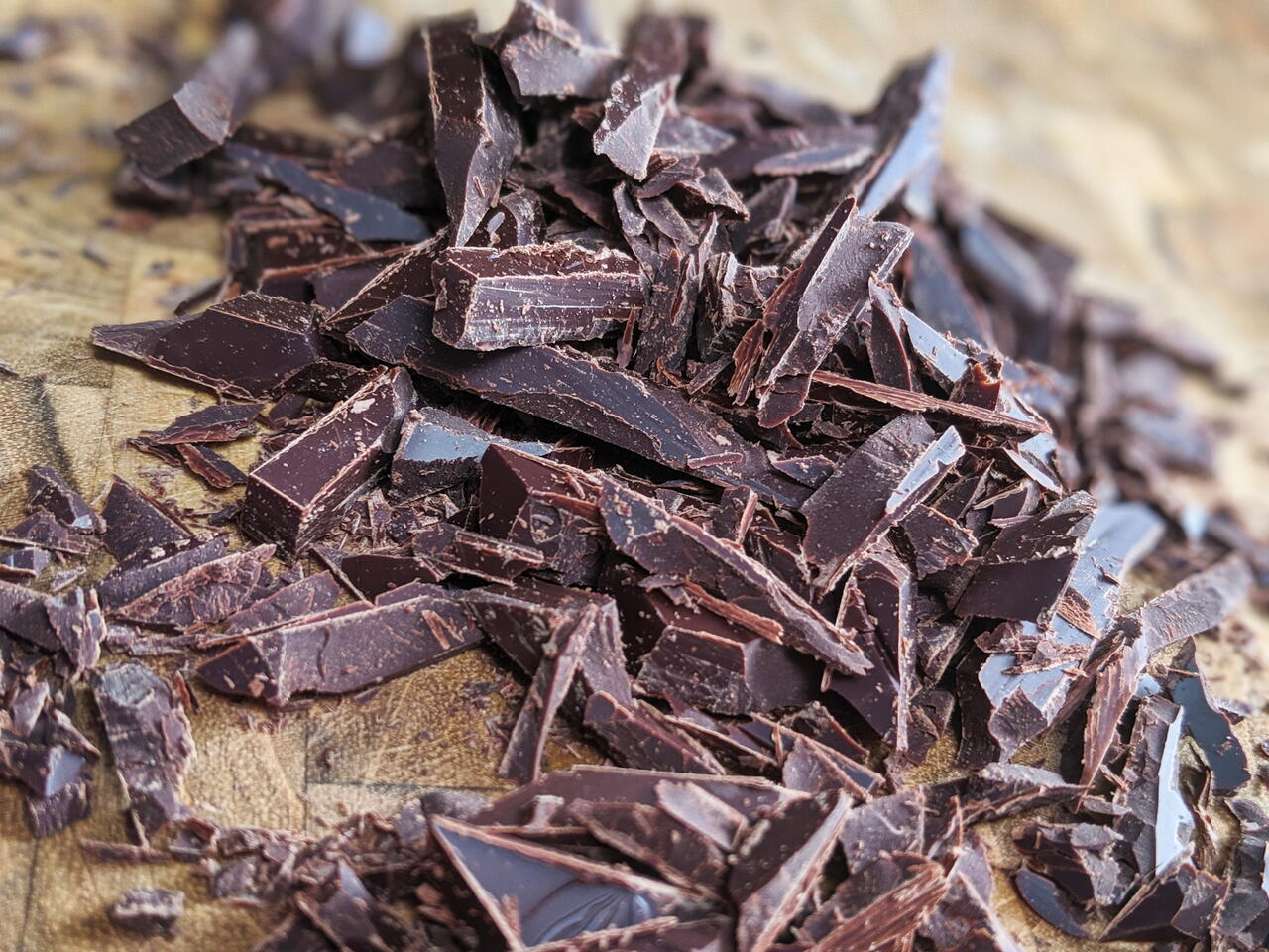 Rock the knife back and forth and keep your non-dominant hand on the bar to steady it as you chop. Keep changing the angle of the bar and chocolate until you get to the end of the bar. If you want to have even smaller chunks you can run the knife through the shards once again.