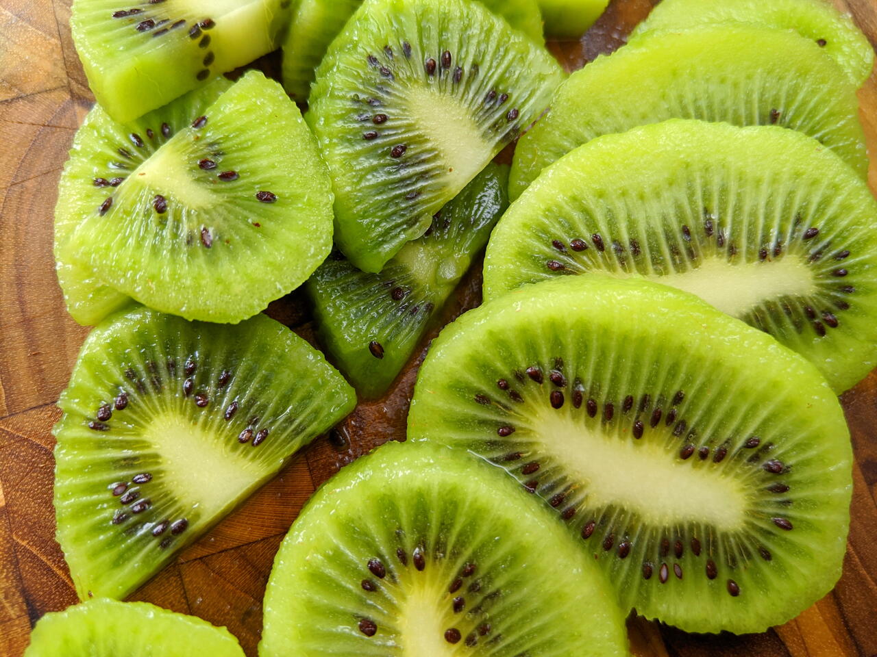 Slice into thin rounds. This is great for the top of a fruit salad or tart so that you can see all the beautiful kiwi seeds.