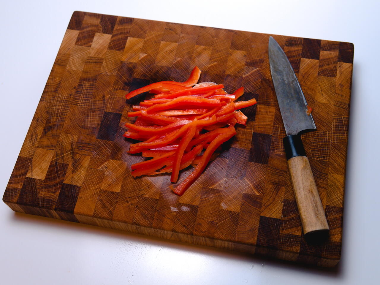This is how I slice peppers for stir fry or fajitas. Slicing from stem to tip like this tends to promote a softer texture.