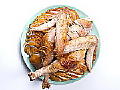 Arrange the turkey neatly on a platter to serve. I like to put the thigh meat in the middle and surround it with the neatly sliced breast meat, then perch the drumsticks and wings on top.