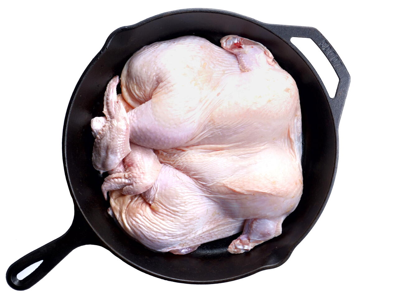 Remove your chicken from packaging and extract giblets if present. Arrange the chicken on a cutting board. You'll need a pair of scissors or a sharp and heavy knife.