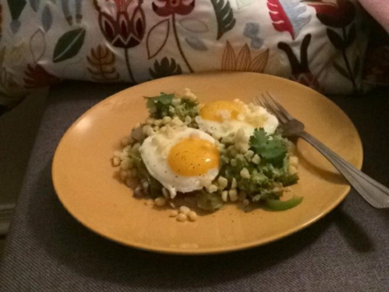 Fry eggs in the same pan. Put everything into a large bowl. Top with eggs and guacamole.