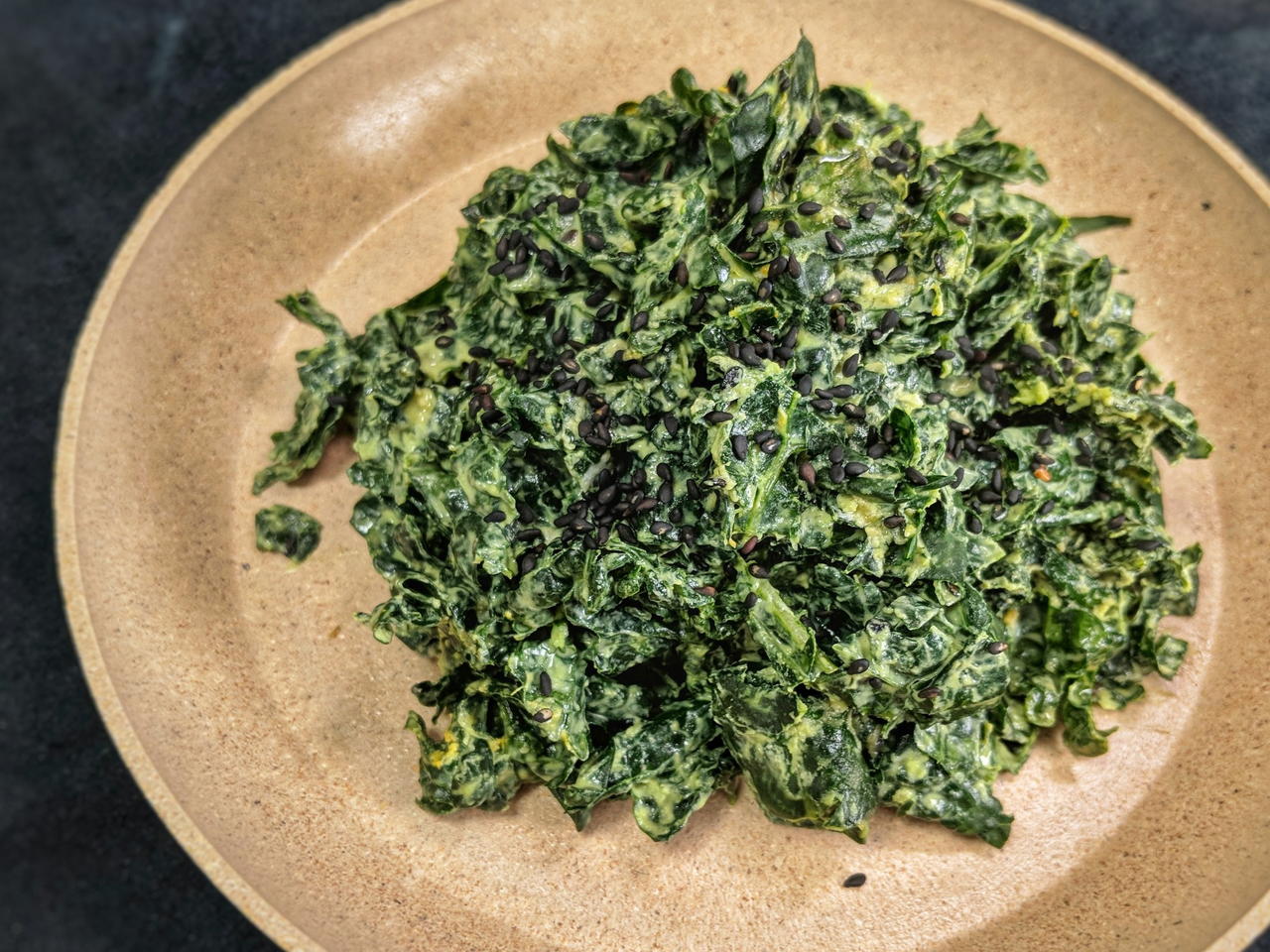 Add the dressing to the kale. Mix well. i added some sesame seeds just for fun. Certainly the sesame seeds make sense because of the tahini, but just about any small nut or seed will be good in this salad.