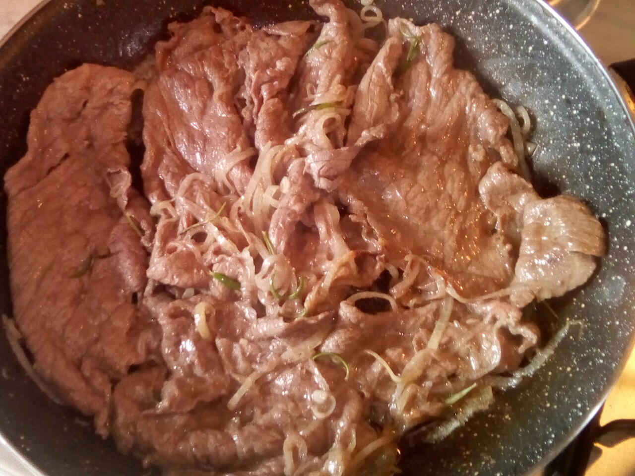 When onions are slightly braised, place the meat slices on them, spreading a bit. Keep heat low.