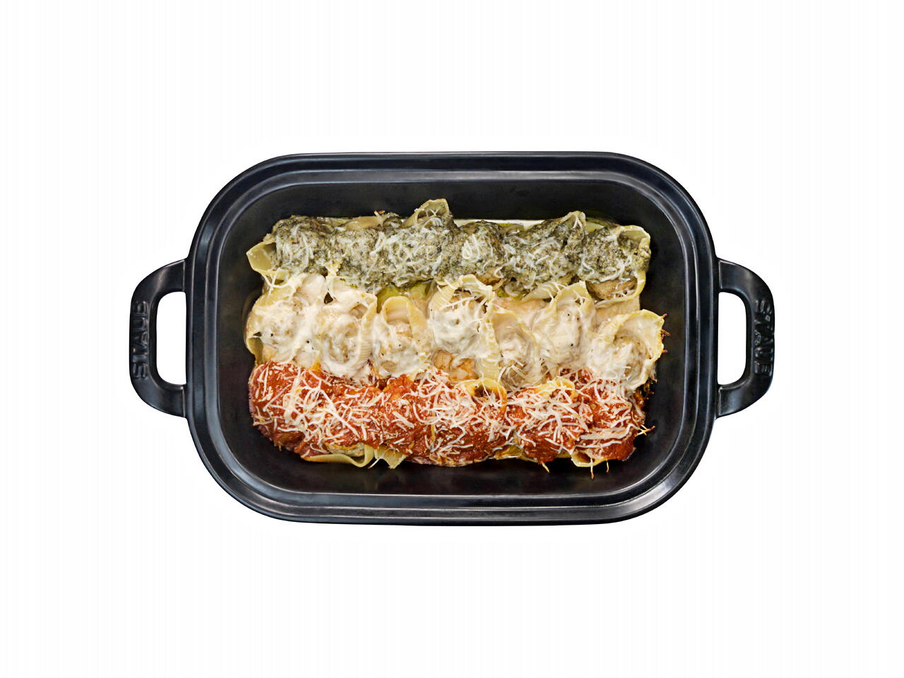 Try this shortcut version of stuffed pasta shells that emulates the Italian Flag with three classic sauces. There is a sauce for everyone!