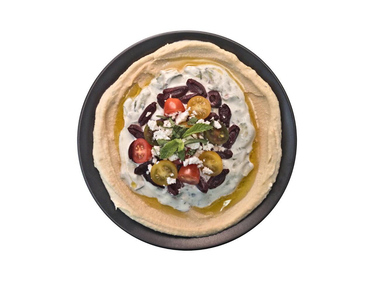 Spread the tzatziki in the middle of the hummus.