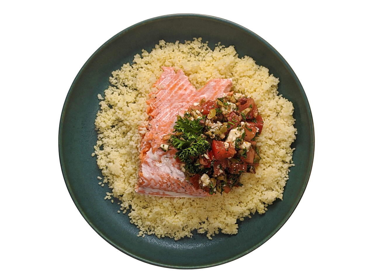 Now one of my new favorite ways to eat salmon, this tapenade topping turns couscous and salmon into a plated meal full of flavor.