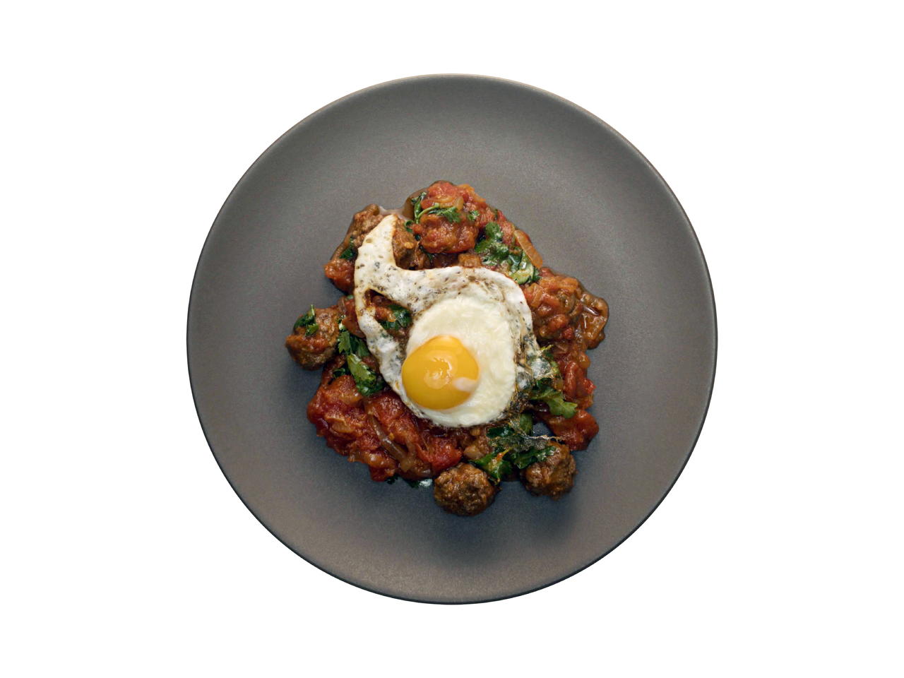 A yolky fried egg pulls together tomato acidity and a richly spiced lamb meatball. Remarkably simple and packed with flavor.