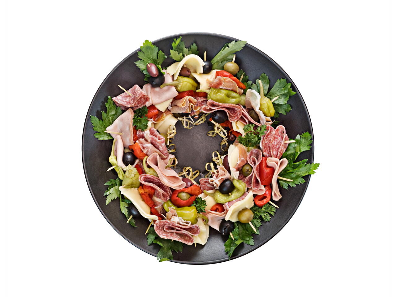 Translate all the delicious ingredients from the classic New Orleans Muffuletta into the perfect bite-sized appetizer. For a little extra holiday festivity, we arrange them in a wreath garnished with fragrant fresh herbs.