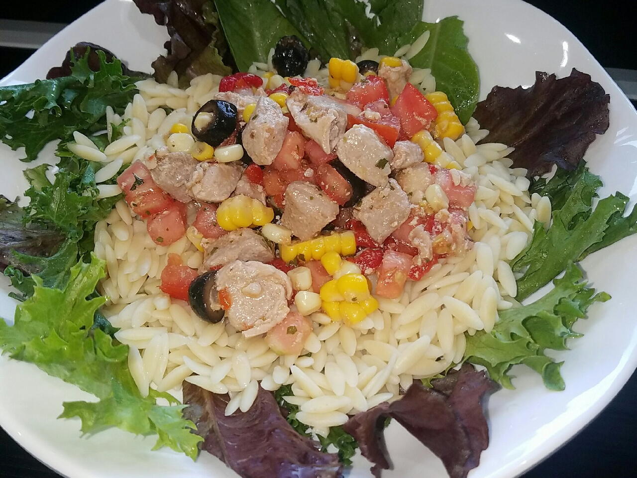 Mix tomato,red peppers, corn and olives in a bowl. Add the tuna,olive oil and parley