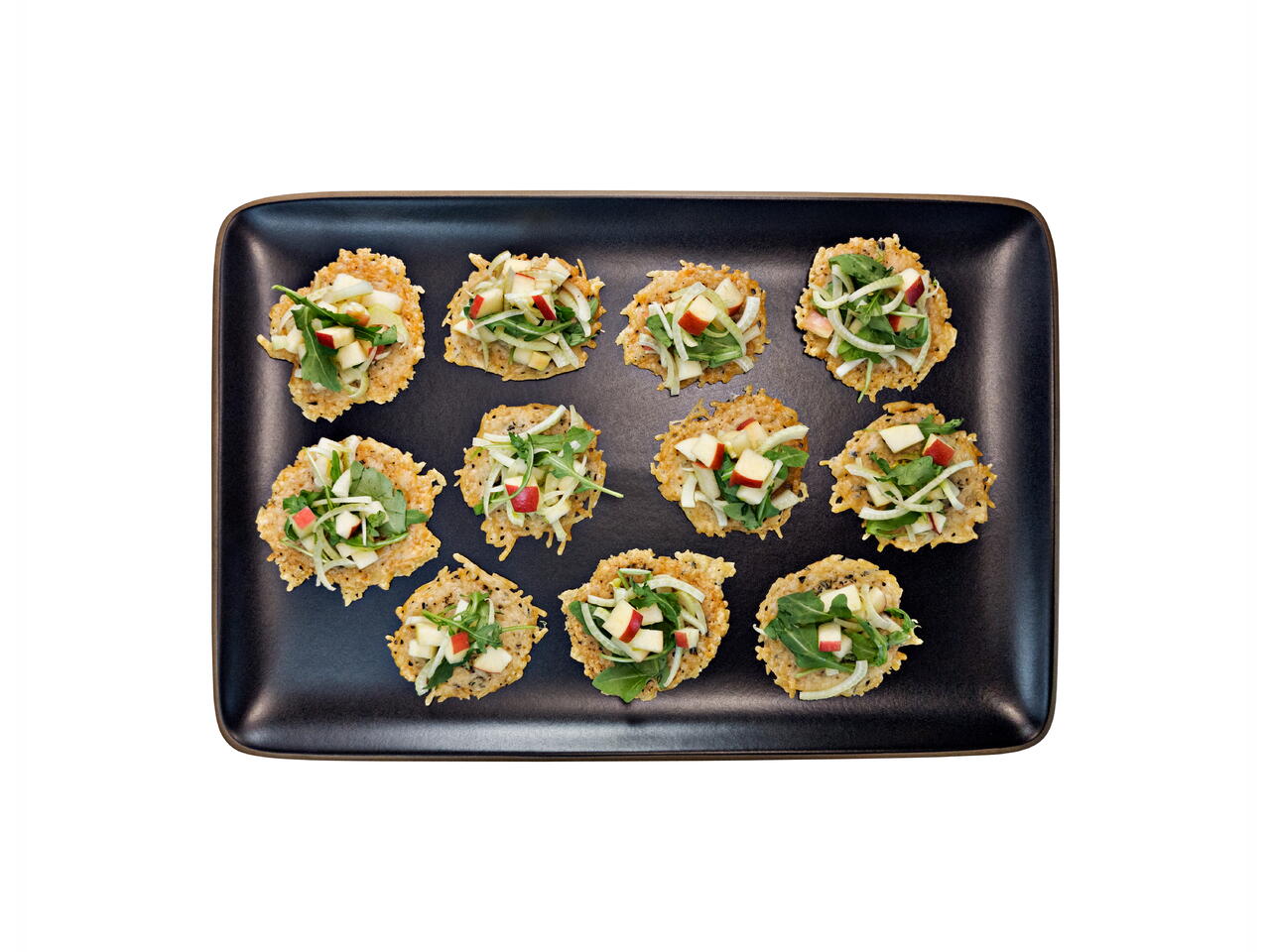 These cheesy crisps are a unique vessel for appetizers! They are easy to make and can be topped with so many things. Here I went with a juicy, fresh apple and fennel salad which is so refreshing alongside the parmesan.