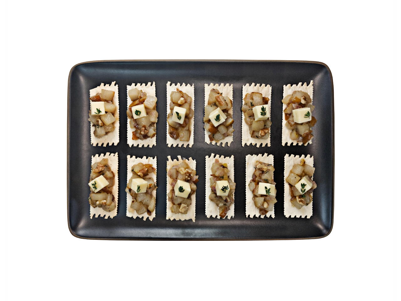I love this sweet and savory pear chutney recipe for the Fall and Winter seasons. The warm herb and tangy vinegar make this chutney so versatile while still capturing the delicious pear flavors. It even pairs well alongside grilled meats, or stuffed inside puff pastry pockets. As an appetizer served here, it's so easy to make ahead and assemble on top of your favorite crackers. Optionally, top with walnuts for some extra crunch.