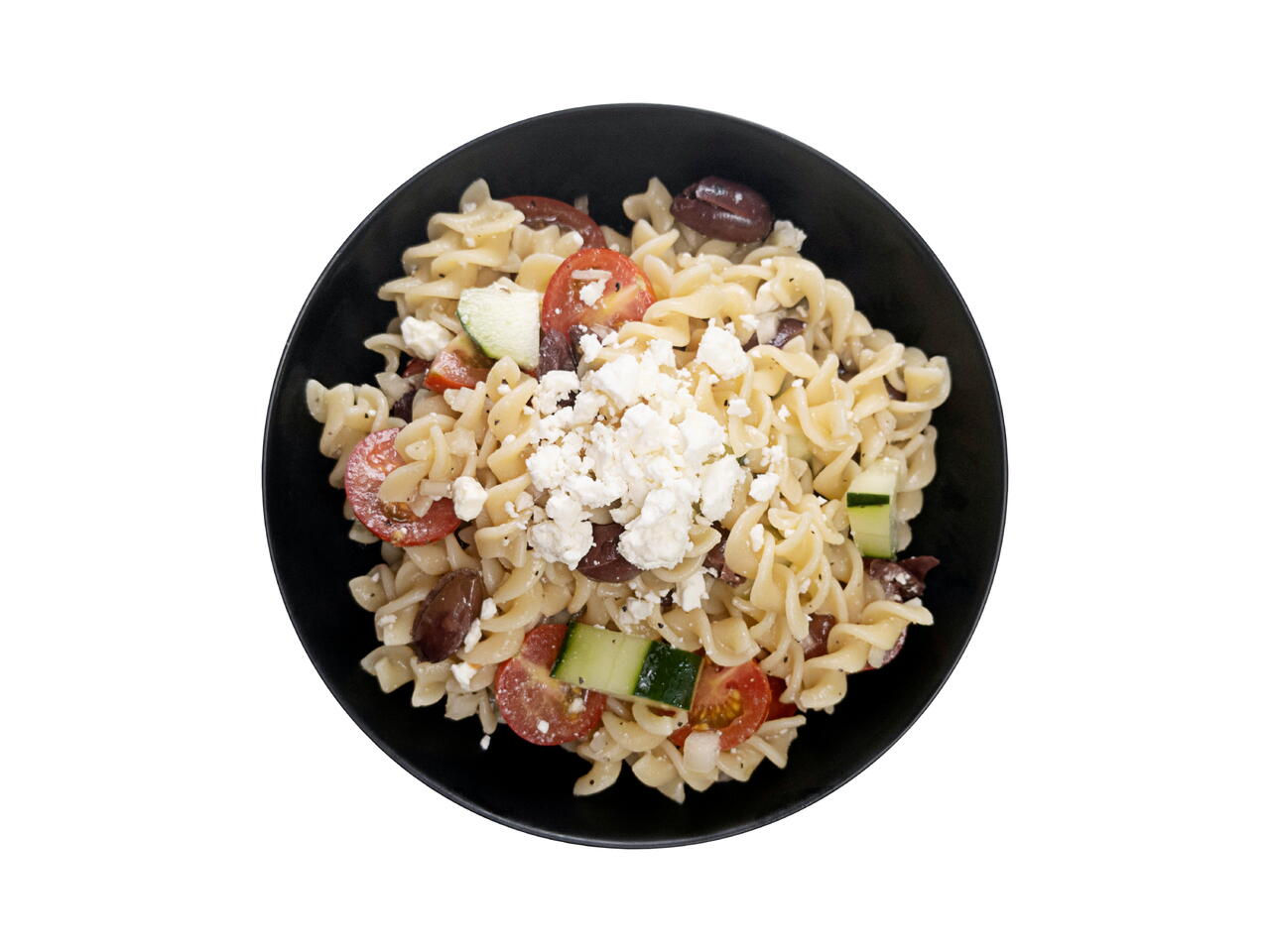 Toss the tomatoes, sliced kalamata olives, and diced onion into the bowl with the pasta.