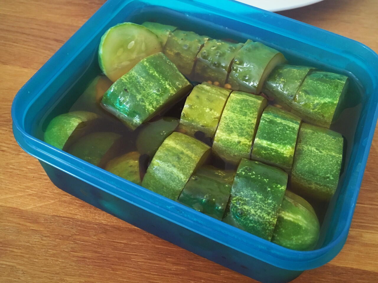 Pack the cucumber slices tightly into a container. Pour the brine over the top to submerge.