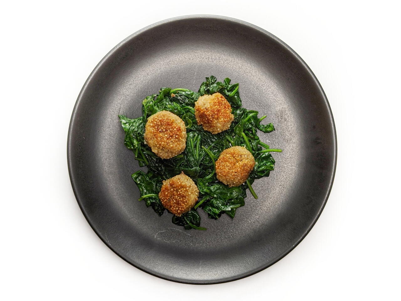 Quinoa-chicken Meatballs with Wilted Spinach