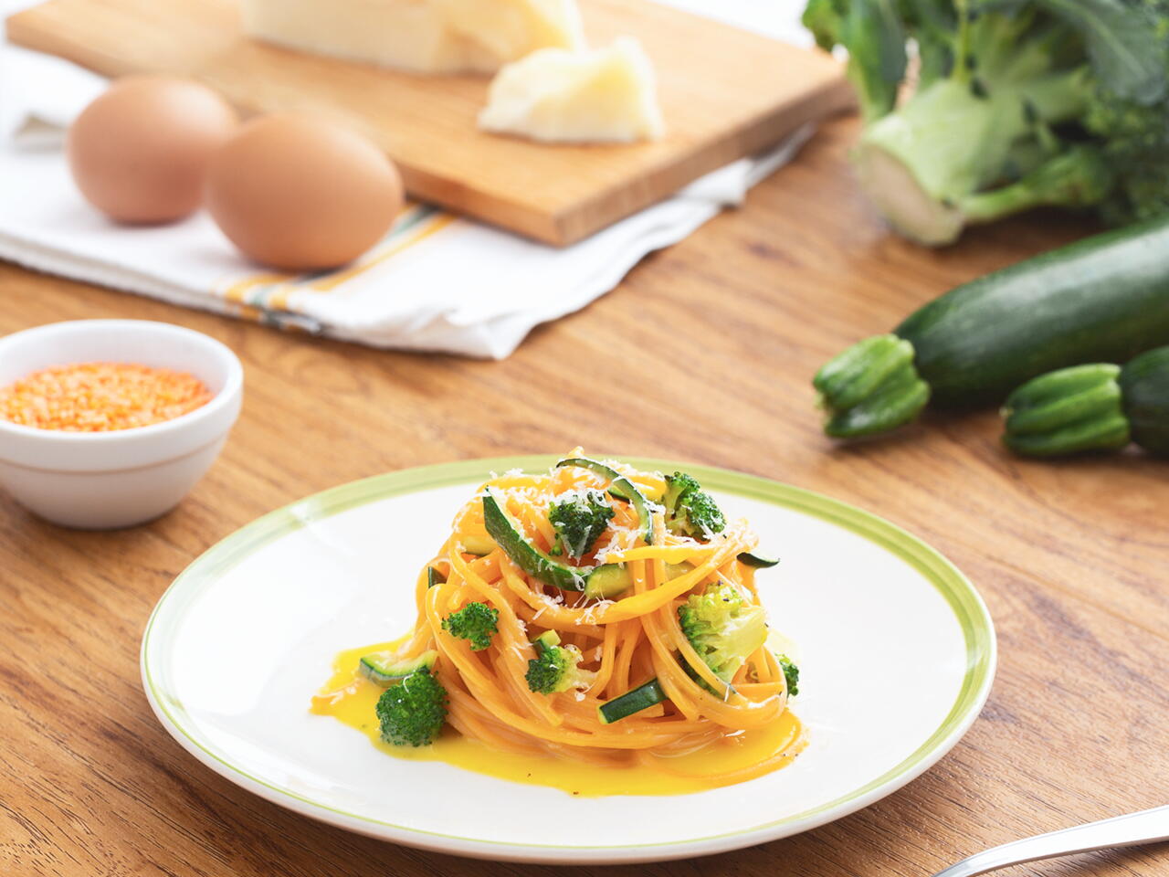 Red Lentil Spaghetti Green Veggies Carbonara Style