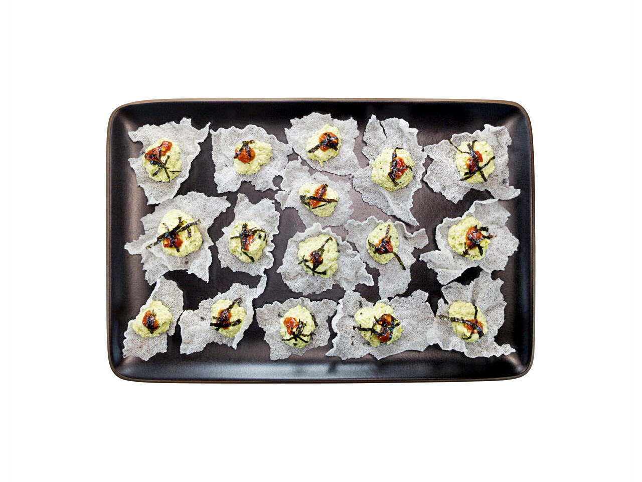 Break the rice paper into bite sized pieces and squeeze or spoon the edamame dip onto them.