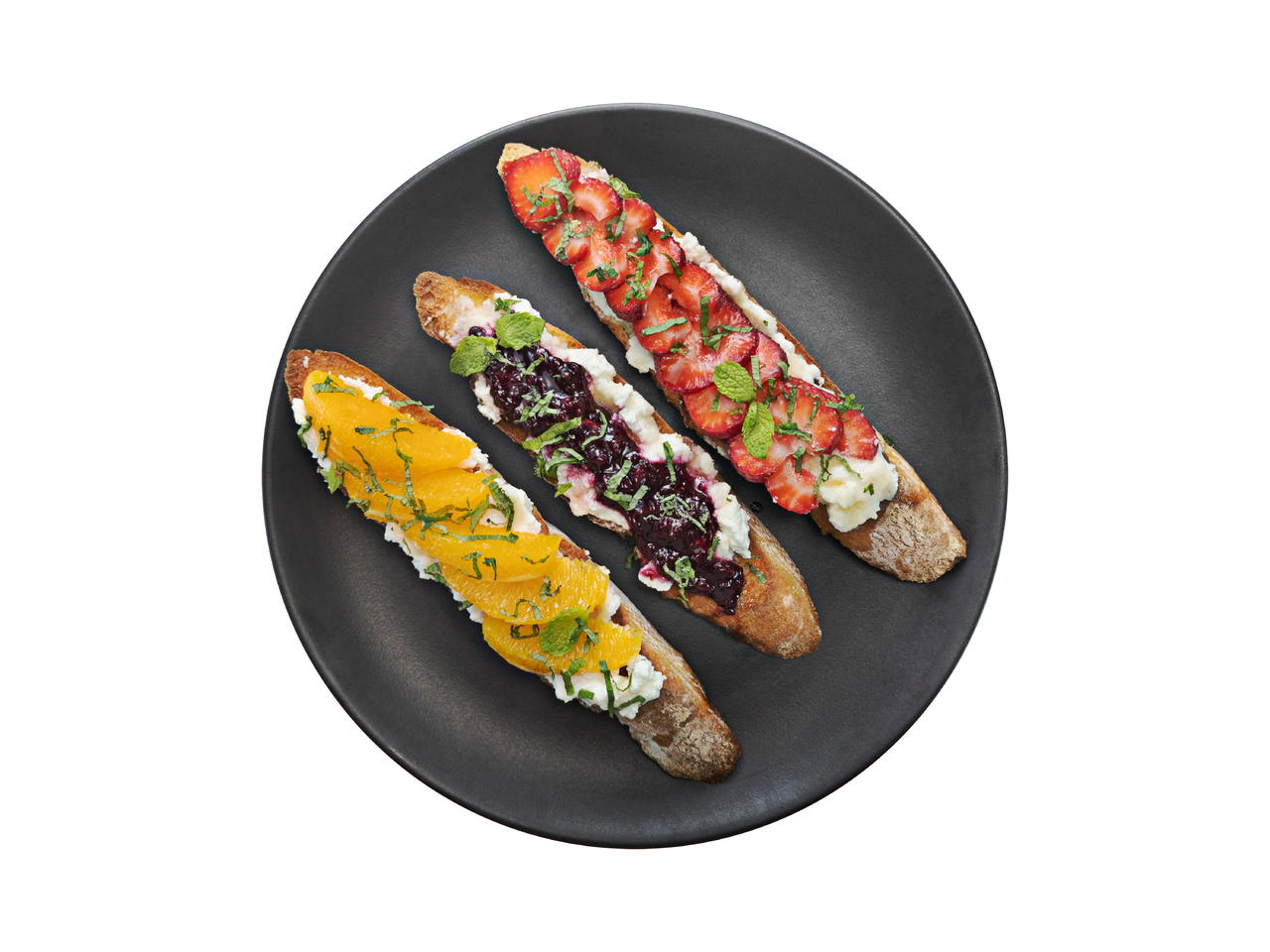 Make beautiful appetizers for a crowd with these sweet ricotta toasts featuring fresh fruit and jam and a sprinkle of fresh mint!