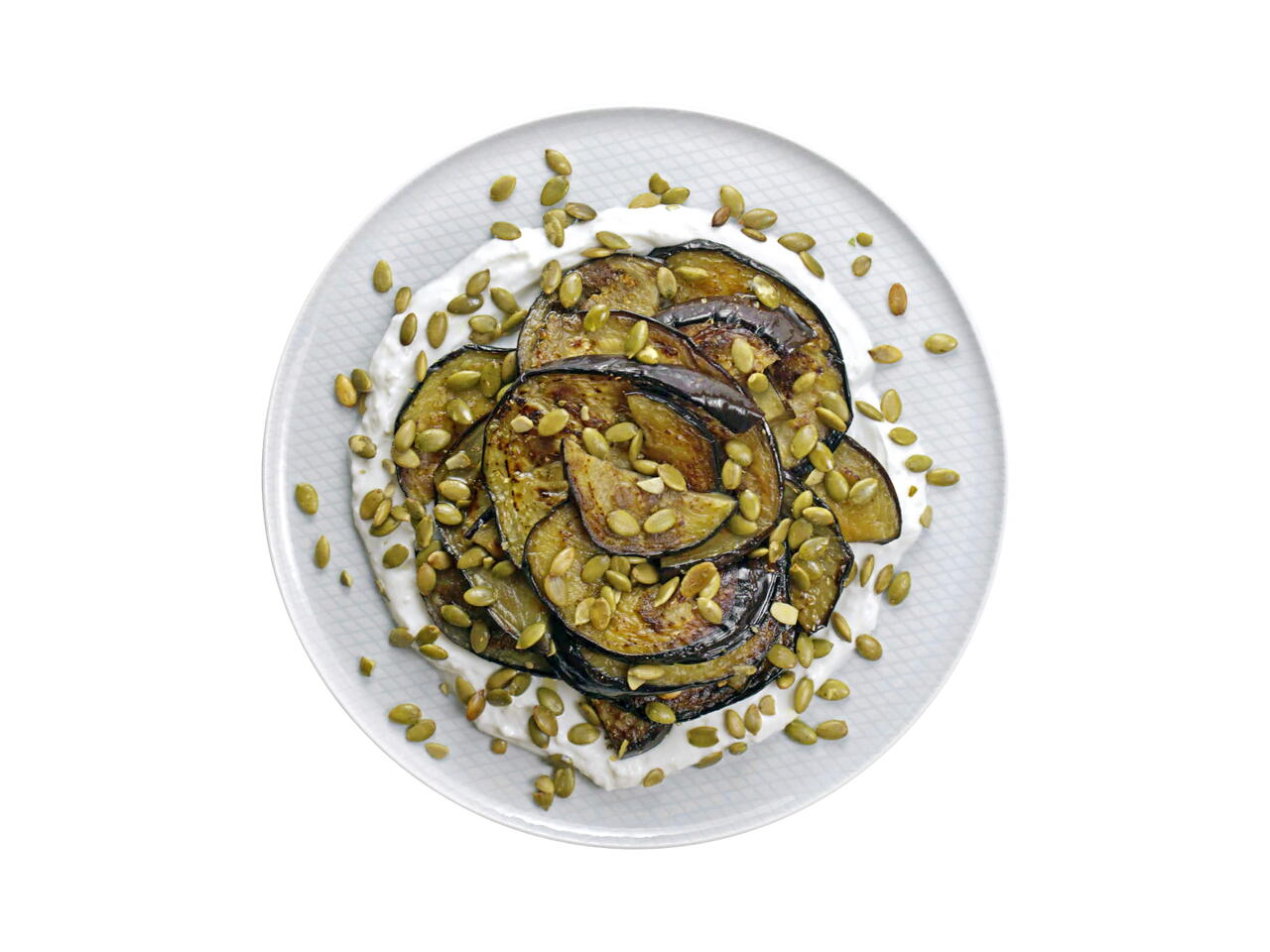 Stack the eggplant slices randomly in the yogurt to build a fun looking pile.