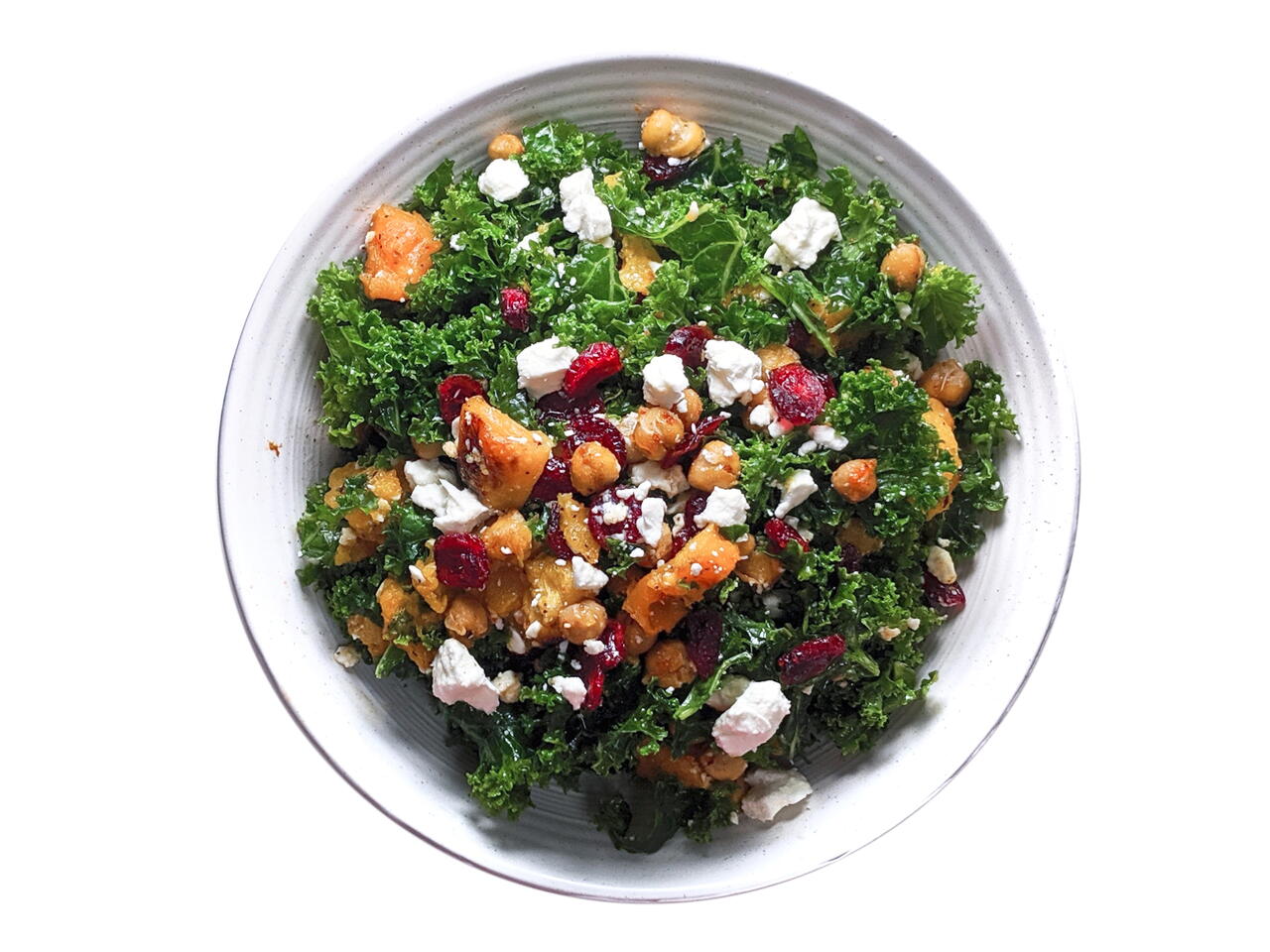 Add the roasted chickpeas and squash to the massaged kale. Add the dried cranberries and crumbled feta next.