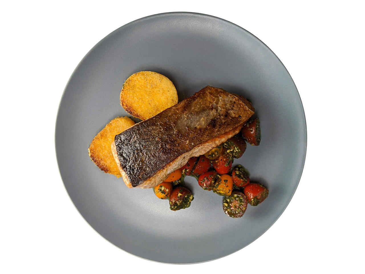 Seared salmon plays well against crispy fried polenta and sweet cherry tomatoes blanketed in pesto.