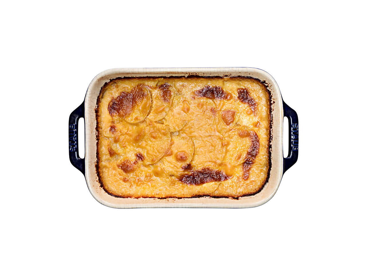 This is a very basic scalloped potatoes recipe, and so a great place to start your homemade scalloped potato journey. A little more effort and a lot more time than the boxed stuff, but totally worth the effort. Add some crispy bacon bits, some ham chunks, or a sprig of thyme to the cheese sauce to take it to the next level.