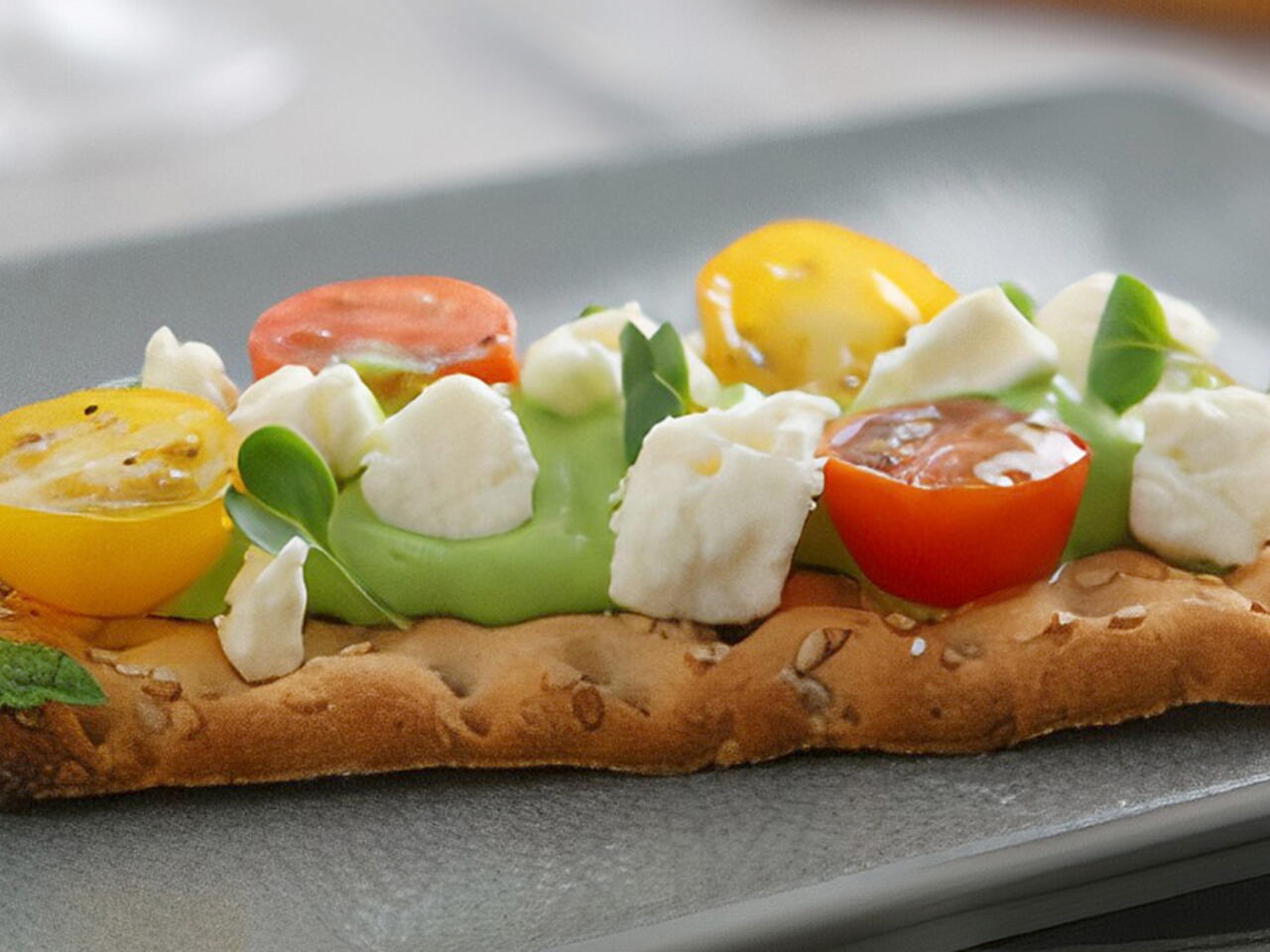 SLICE cherry tomatoes in half and place on top of pea mixture