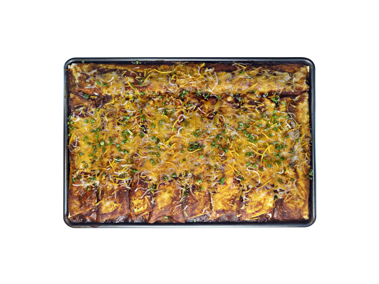 Pour a layer of enchilada sauce into the sheet pan to cover the bottom of the pan.
