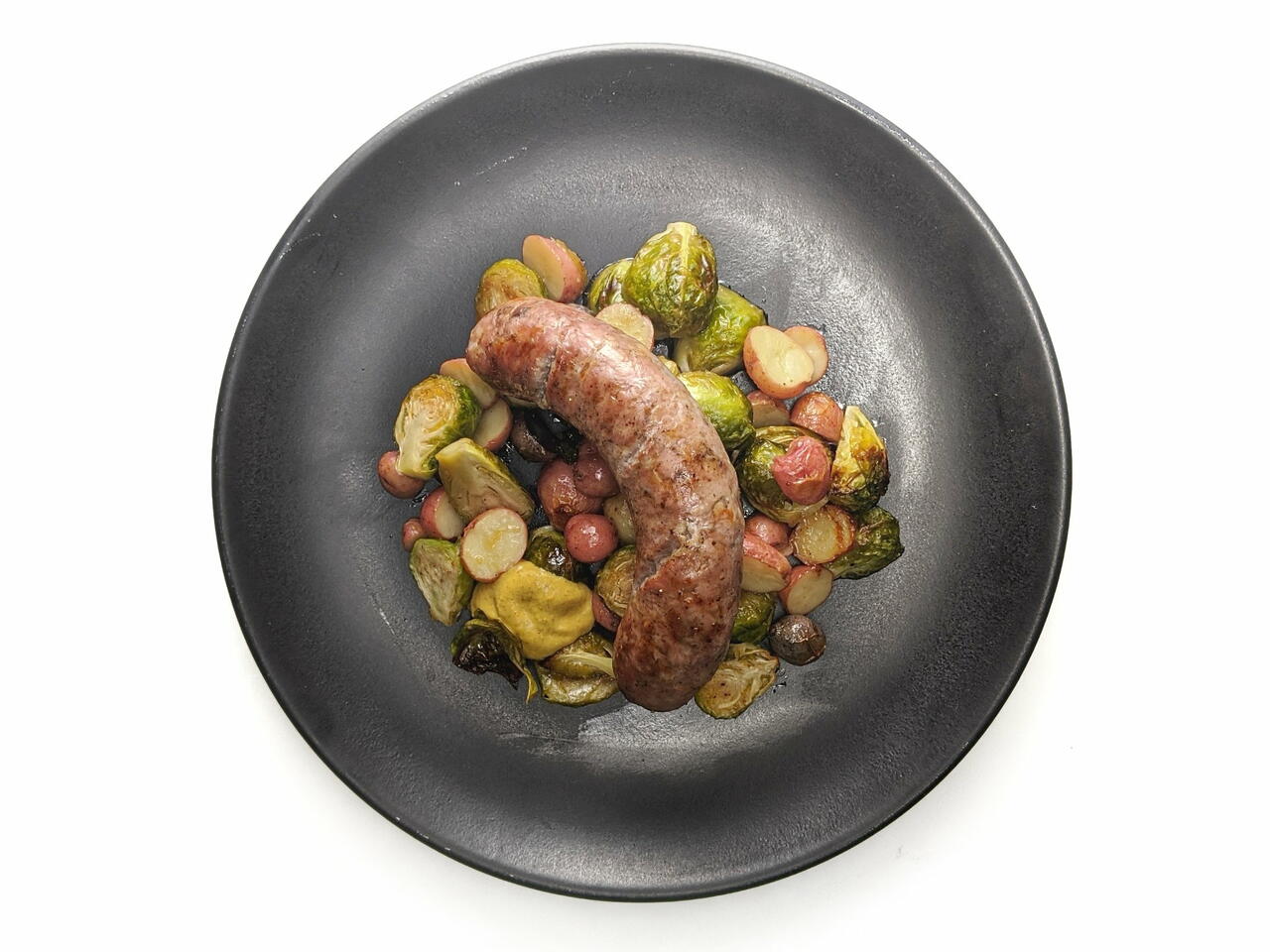 Sheet Pan Sausages with Potatoes and Brussels Sprouts