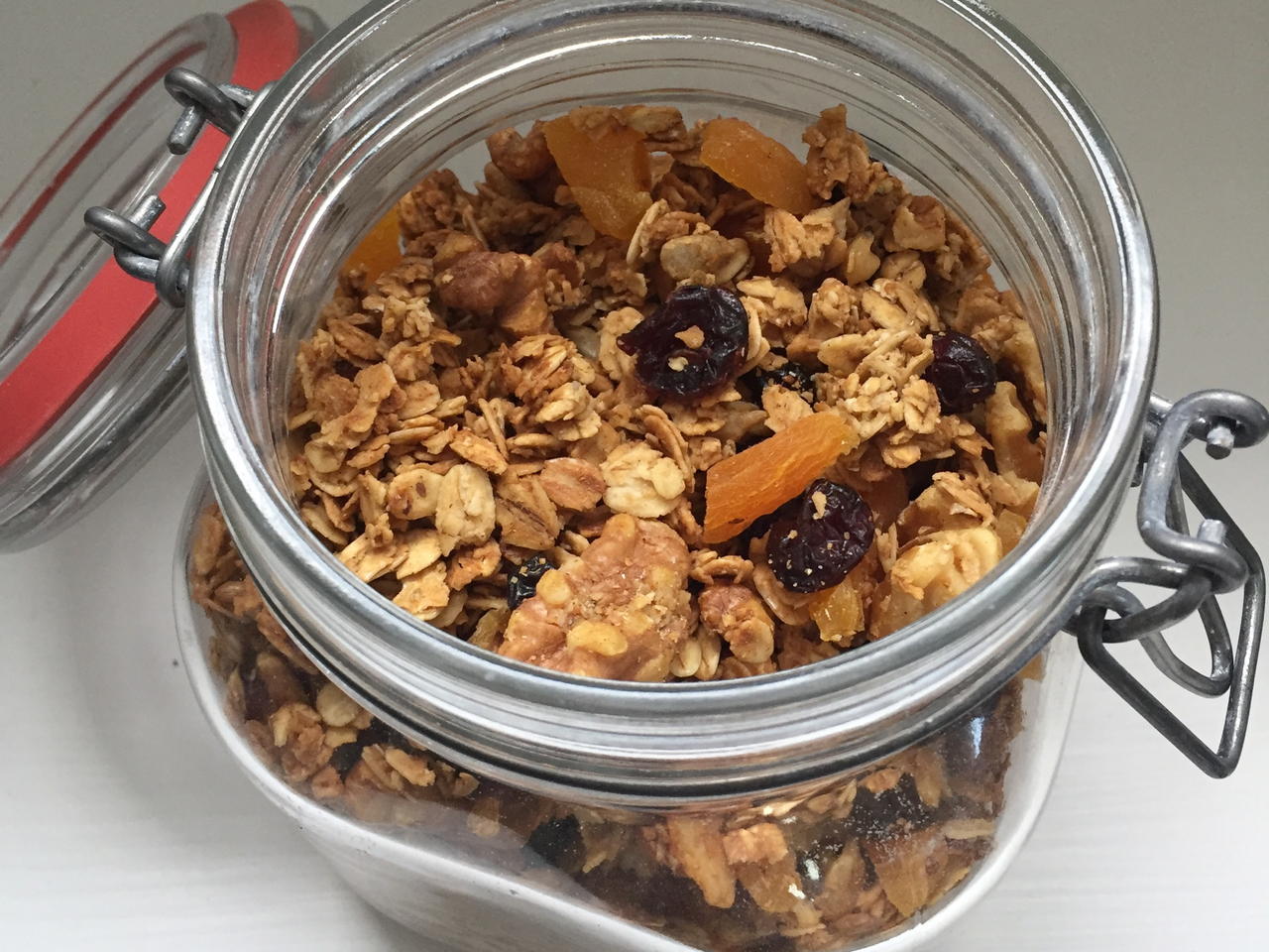 This is an easy granola recipe you can modify with ingredients you have on hand. It is low in added sugars and a good source of dietary fiber! It will store at room temperature for about three weeks. https://cookingmatters.org/recipes/homemade-granola