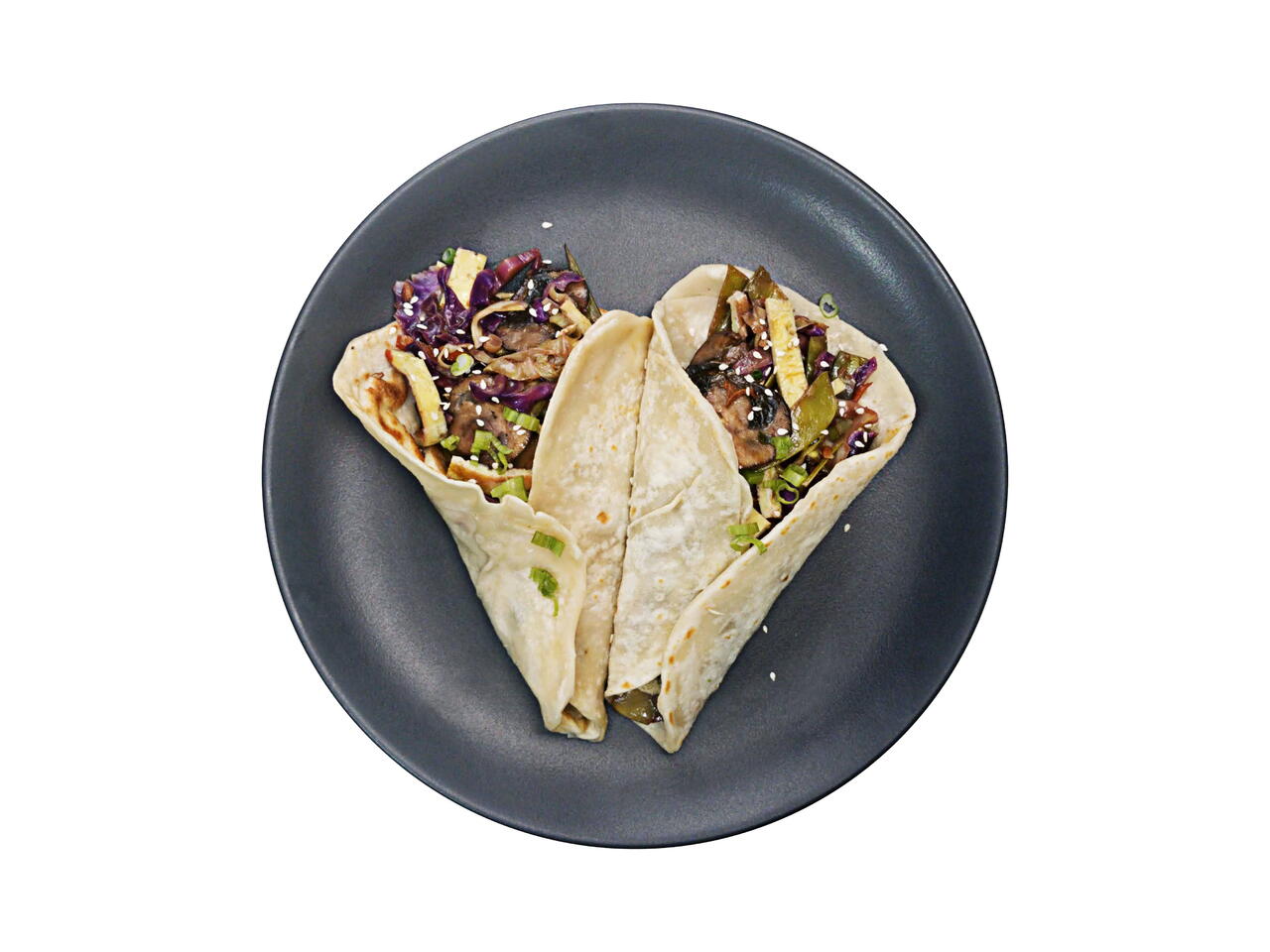 Moo Shu pork is orignially a Chinese dish that has become very popular in Chinese-American cuisine. This veggie-only version is adapted to be super easy to whip up and is quite delicious. They are eaten just like a taco, served with Mandarin Pancakes, often substituted with flour tortillas.