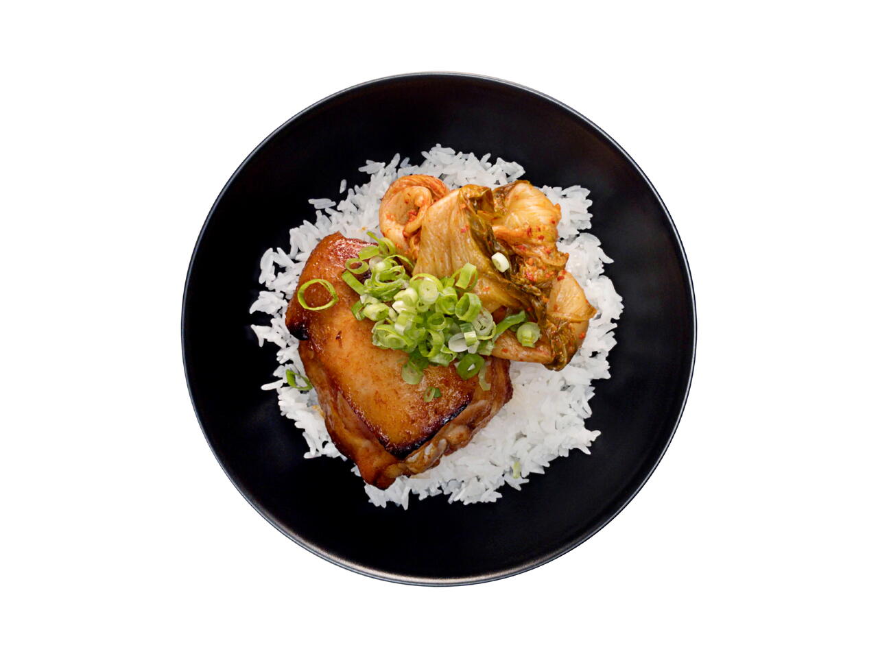 Serve chicken thighs with rice, scallions and some good kimchi.