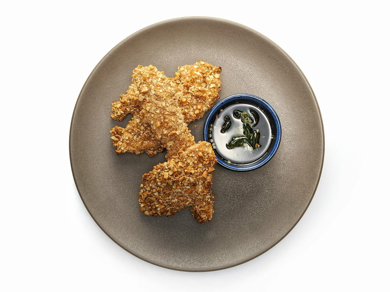A pretzel coating gives these chicken fingers a unique, salty crunch that goes great with sweet and spicy jalapeño honey.