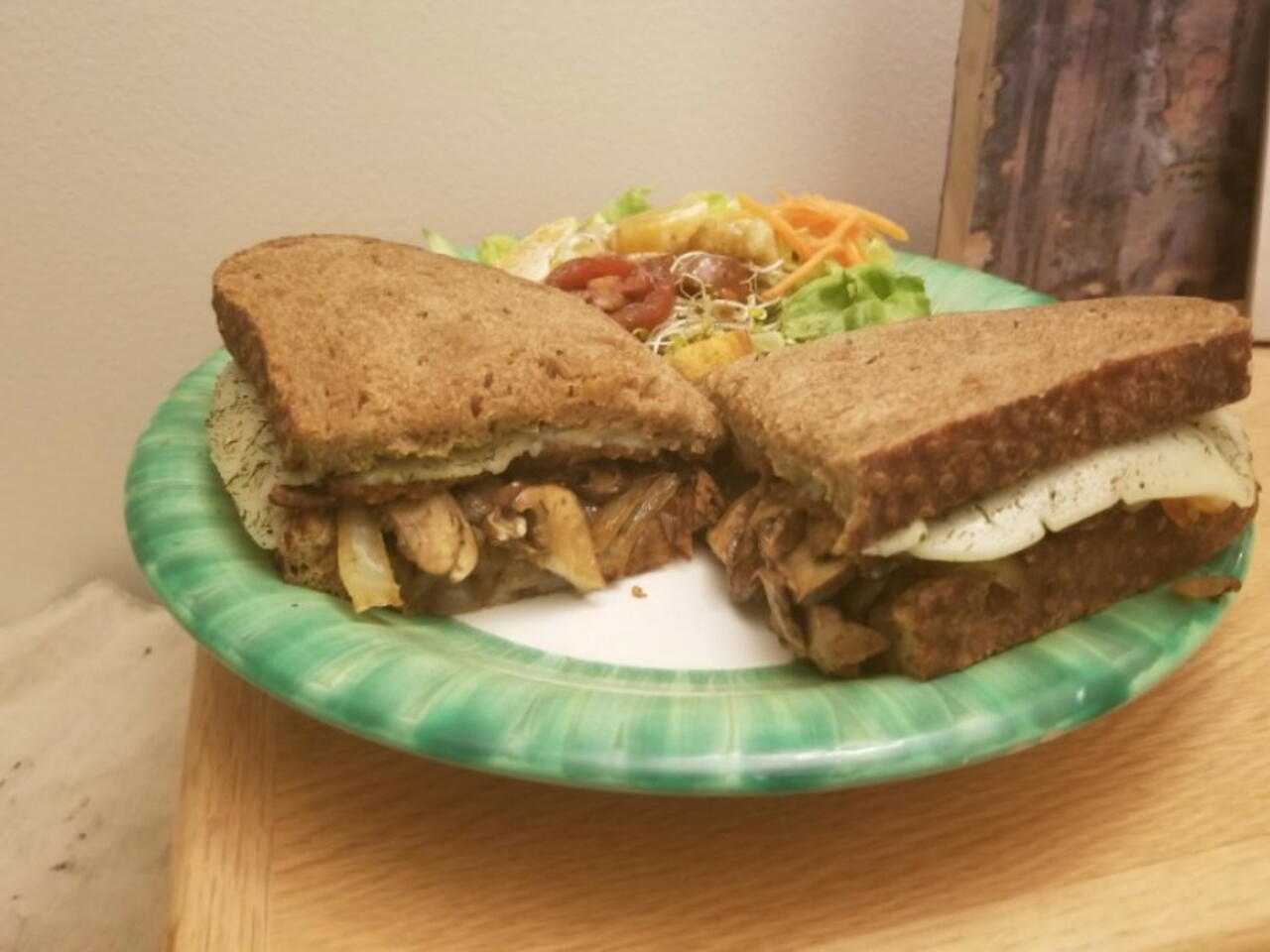 While the onions are cooking, slice your shrooms and add 2tbsp liquid smoke - or whatever you prefer for taste, that stuff is potent! Add Worcestershire and dill and glory in your victory over the portabellinis 💯