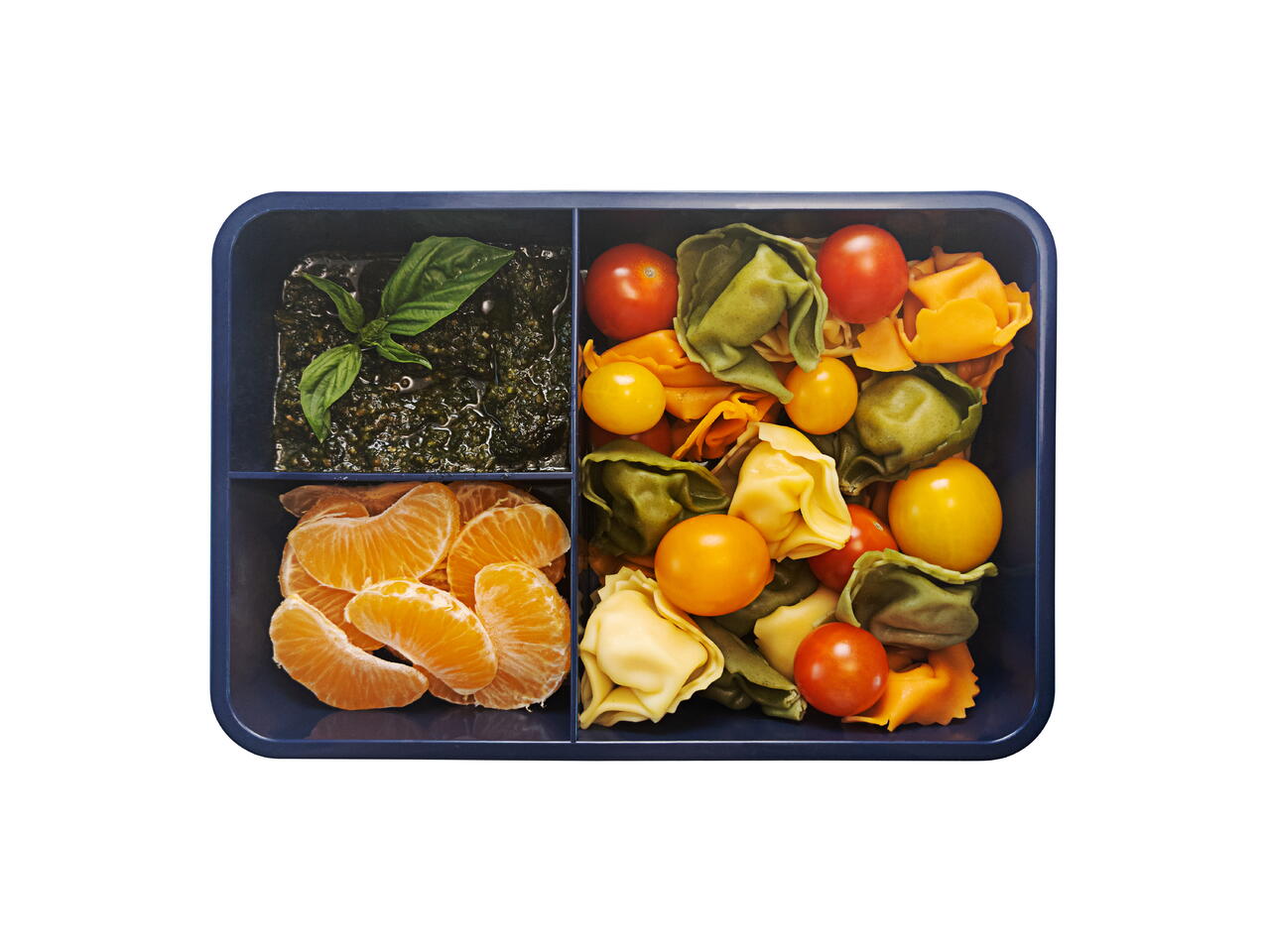 Assemble the lunch box with the pesto, cherry tomatoes, and mandarin orange. You can choose to mix the tortellini and tomatoes or leave them separate. Younger kids usually need their oranges peeled for them :)