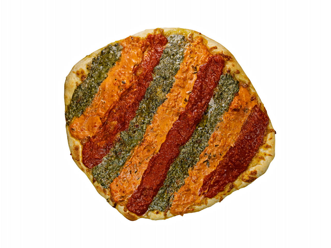 Spread the pesto, vodka sauce, and marinara sauces in stripes across the pizza.
