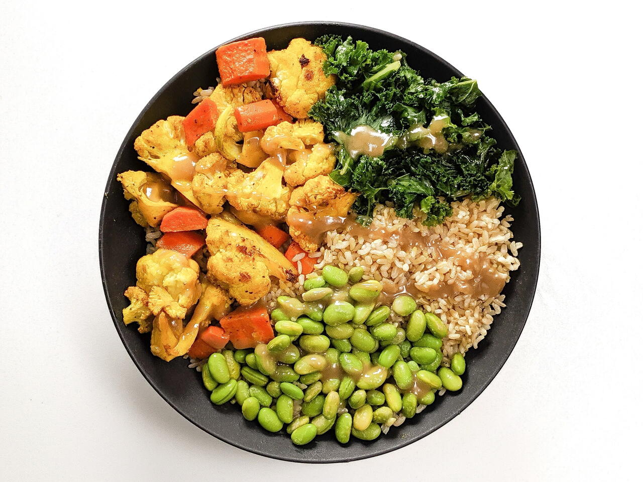 Warm up the rice according to package instructions, and divide between 4 bowls. Portion the roasted turmeric cauliflower and carrots, massaged kale, and edamame evenly across the bowls.